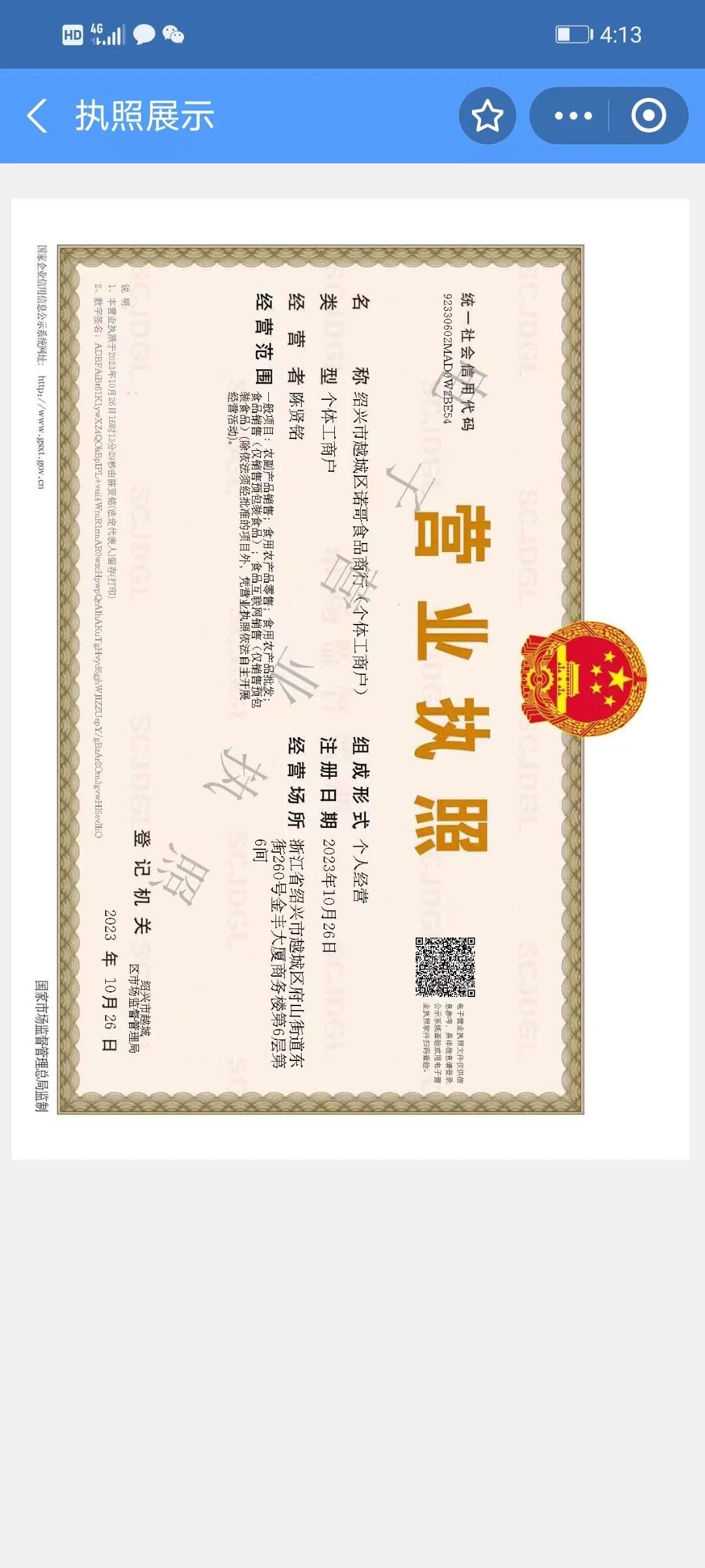 执照名称:绍兴市越城区诺哥食品商行 (个体工商户)