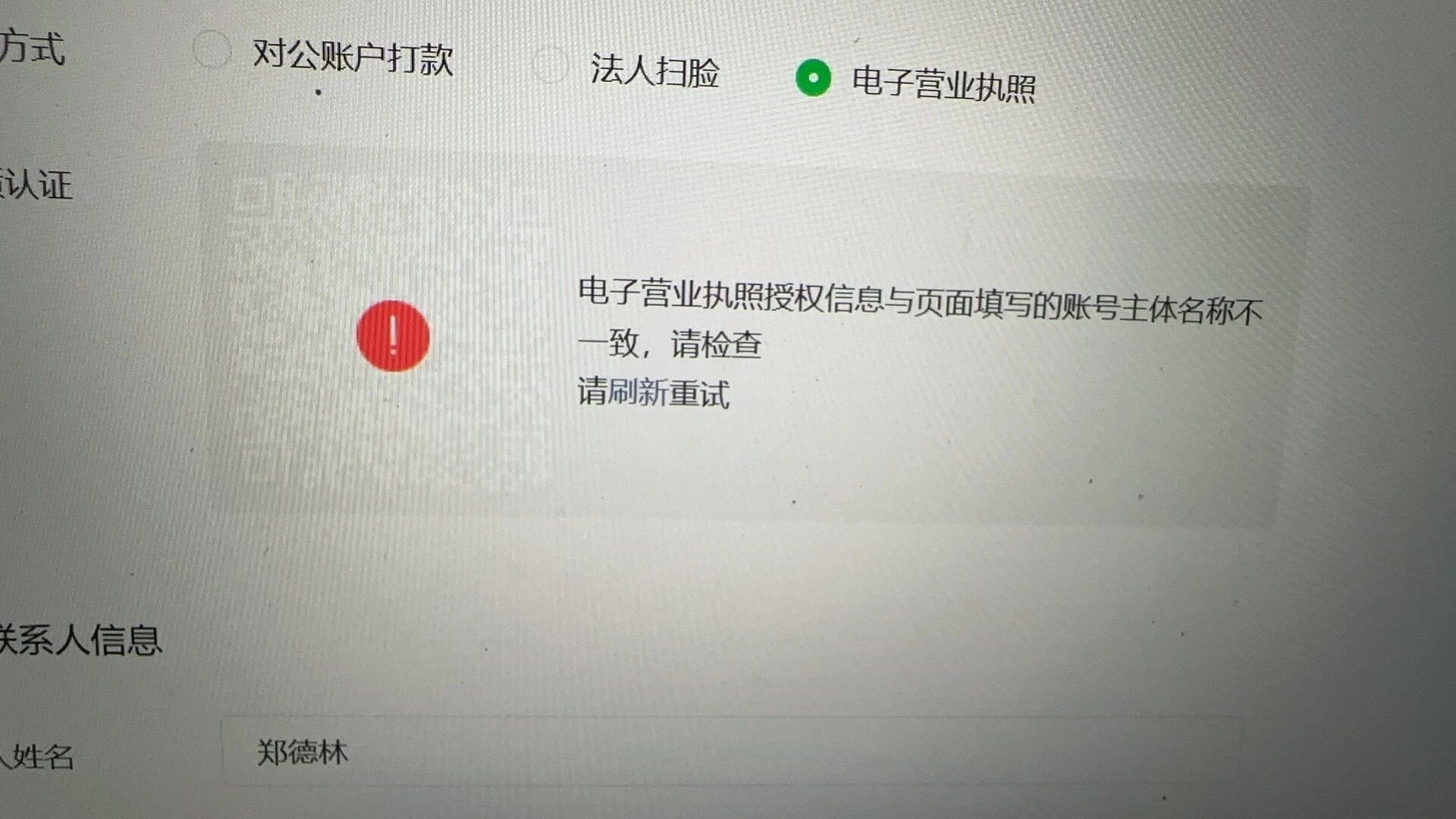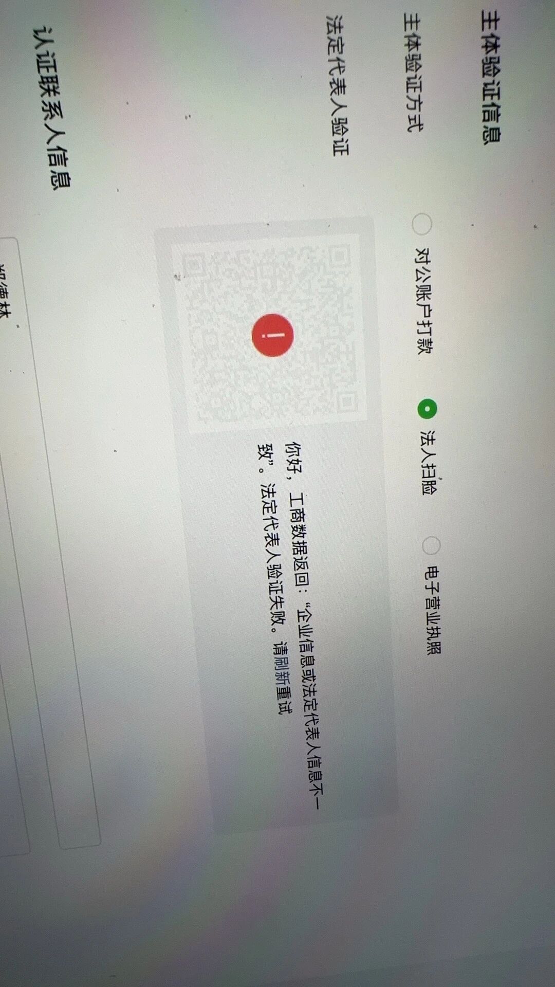 就是我们填写信息很多次信息都是对的但是系统显示是与法人不一样