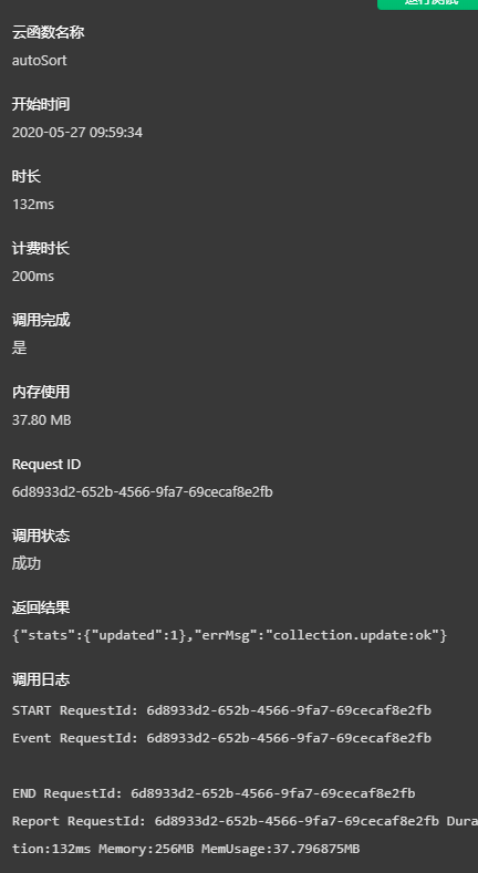 上面是使用触发器调用的日志,下面是使用云端测试的结果