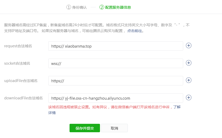 想把小程序的downloadFile合法域名配置为:yj-file.oss-cn-hangzhou.aliyuncs.com 但总是提示不合法。