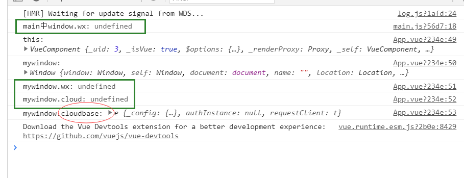 但是却不知道怎么把它拿出来用。在main.js和app.vue页面都无法打印出来。通过npm安装的cloudbase可以打印出来