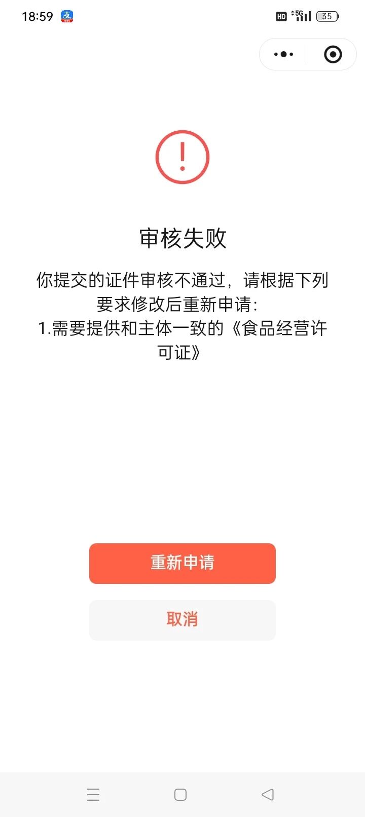 学校食堂用的是统一的食品经营许可证,只是每个档口的编号不一样,为什么不给通过?别的档口都申请成功小程序了,为什么我们家不能通过?