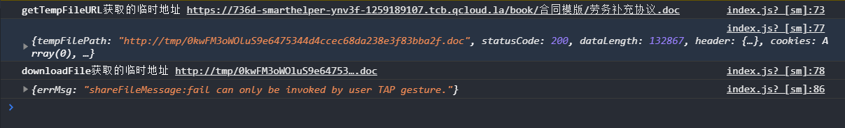 所以想请教各位大佬,如果跟临时地址前缀没关系的话。为什么我在真机调试模式下还提示我需要点击按钮才能运行?我的确是在手机上点击的按钮执行的。如果我这种写法不对的话,也请各位大佬指点一下。怎样才可以将云存储的文件分享给好友。本人接触小程序时间不长。因为小程序中有这个需求,真心感谢各位大佬的帮助!谢谢