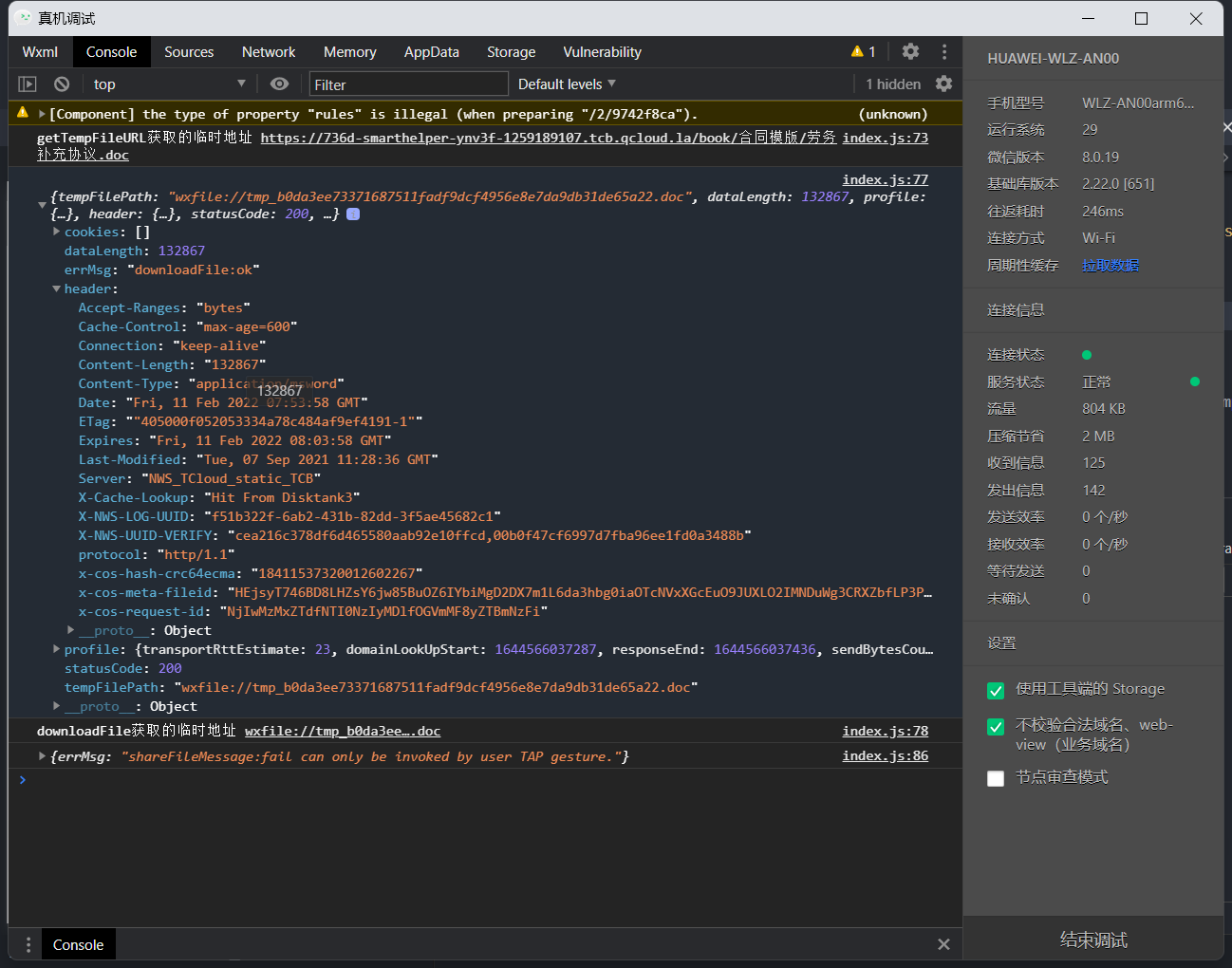 这个结果虽然IDE环境会报错,但是这种临时地址我在真机调试模式下是可以分享的。一切正常。不过昨天再次使用真机调试测试,返回的就是下面这样的结果了