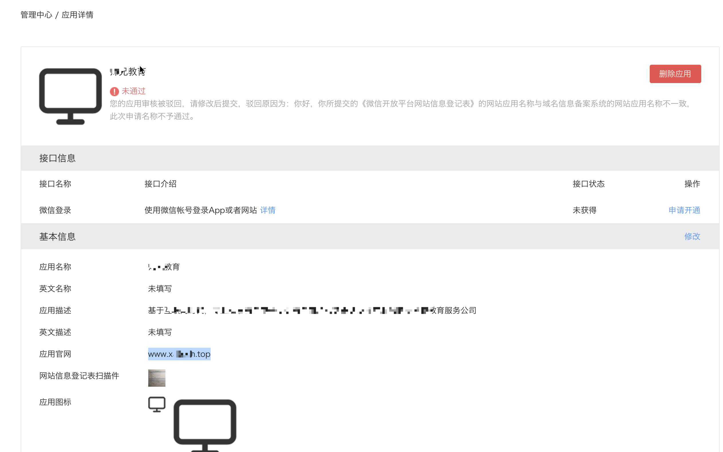 您的应用审核被驳回,请修改后提交,驳回原因为:你好,你所提交的《微信开放平台网站信息登记表》的网站应用名称与域名信息备案系统的网站应用名称不一致,此次申请名称不予通过。