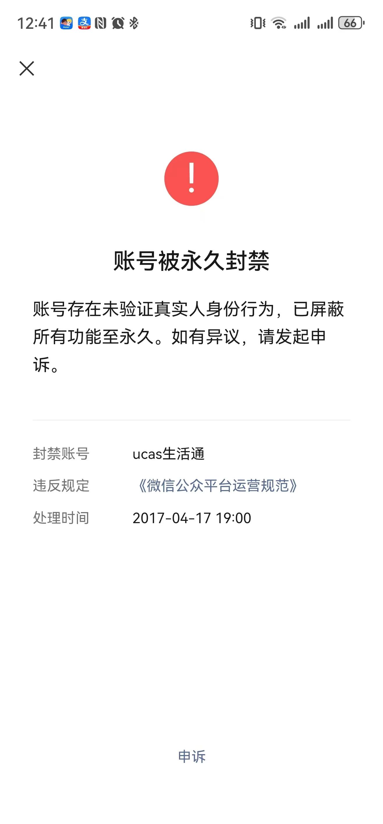 由于身份证到期后未验证,微信公众号被永久封禁。因为该账号长期未使用,以至于都忘记该账号的存在了。账号ID:iloveucas 。该账号未存在违规等问题,于2017年4月被封禁,这种情况下还能解封进行注销么?因为影响了自己的微信账号注册新的公众号了,求助大家。