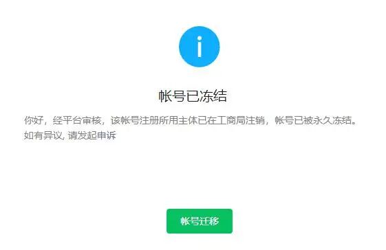 我们有一个公众号显示“经平台审核,该帐号注册所用主体已在工商局注销,帐号已被永久冻结。”要怎么处理呢?