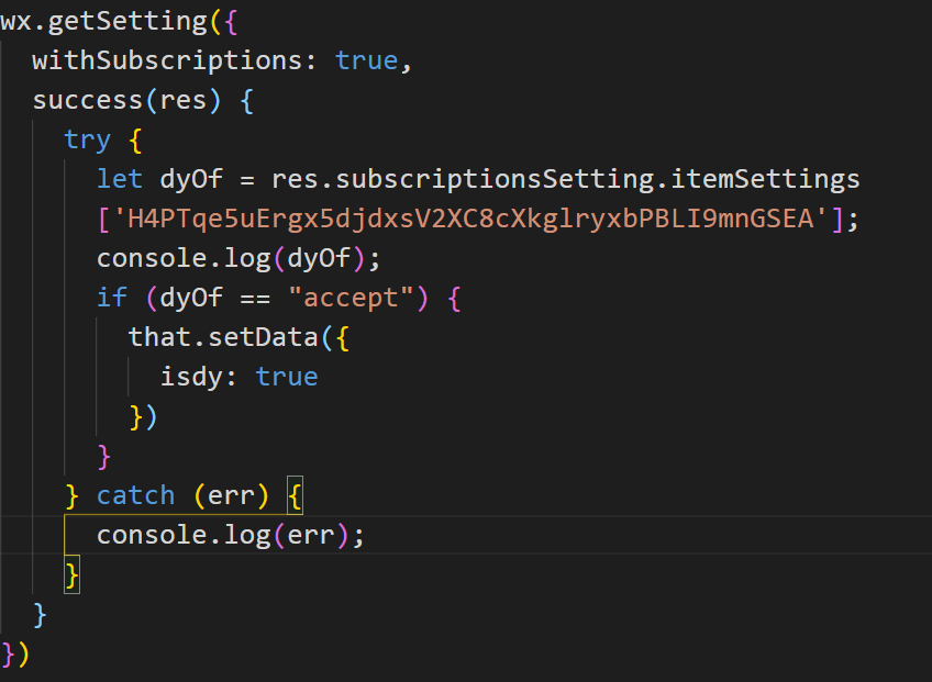 可以很清楚的看到,文档上说了,itemSettings 只返回用户勾选过订阅面板中的“总是保持以上选择,不再询问”的订阅消息