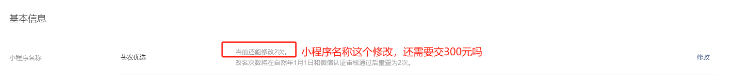 小程序基本信息界面显示,小程序名称当前还能修改2次,这个修改是还需要再交300元吗