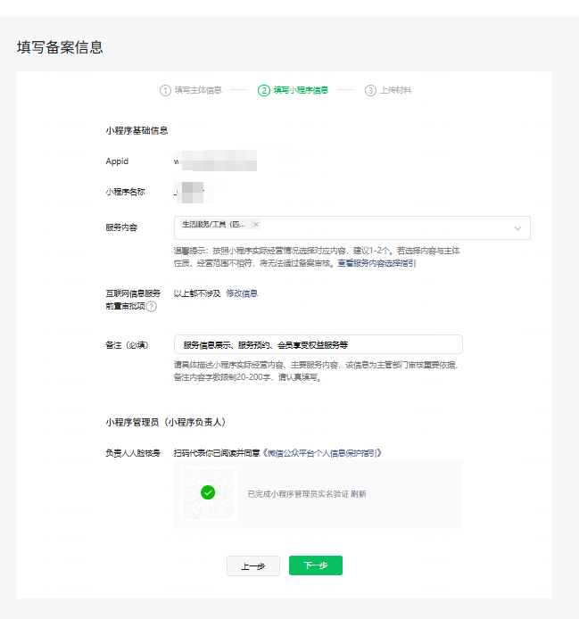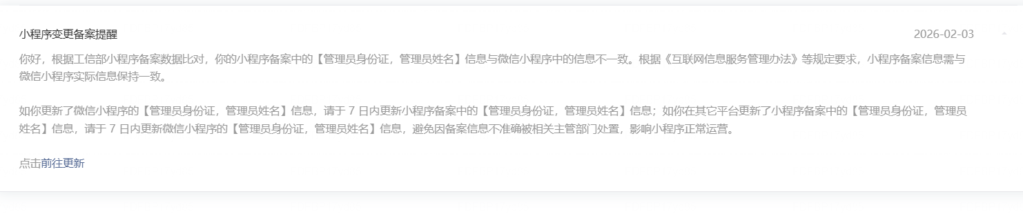 2)若当前小程序备案信息未进行过变更,麻烦请私信提供完整主体负责人的界面截图、小程序后台管理员信息截图、小程序备案详情【小程序负责人】页面截图、小程序appid以便核实