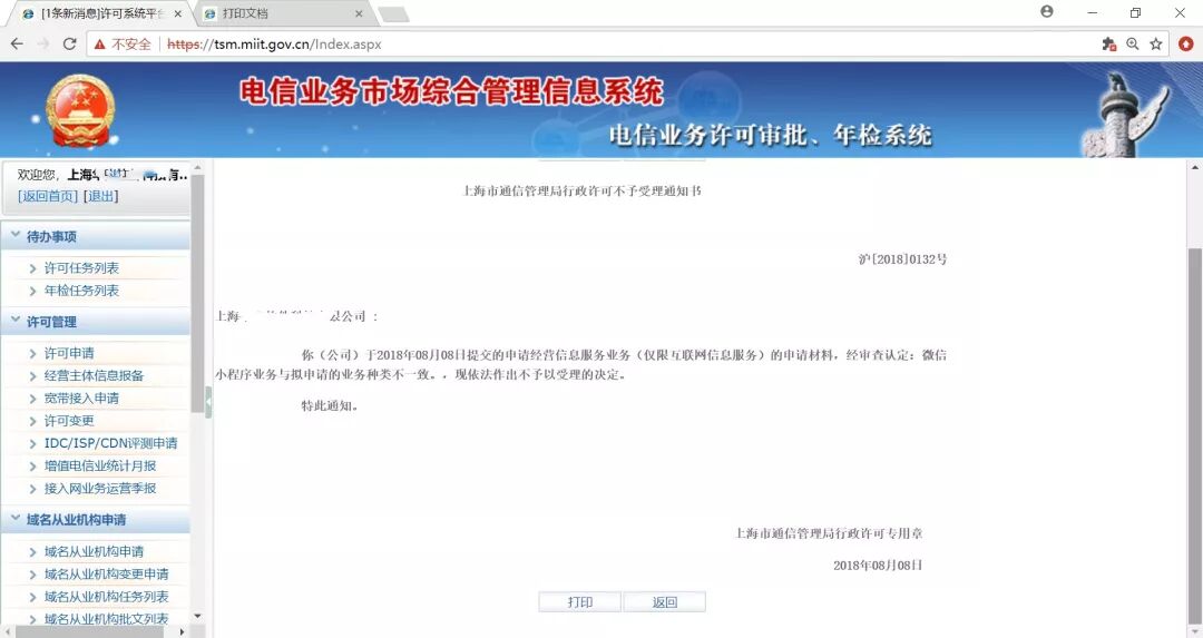 正如答复里说的,我们之前就是按要求提交了申请材料、也解释了小程序涉及到的信息服务的功能和情况,得到的是不予受理的正式答复结果。