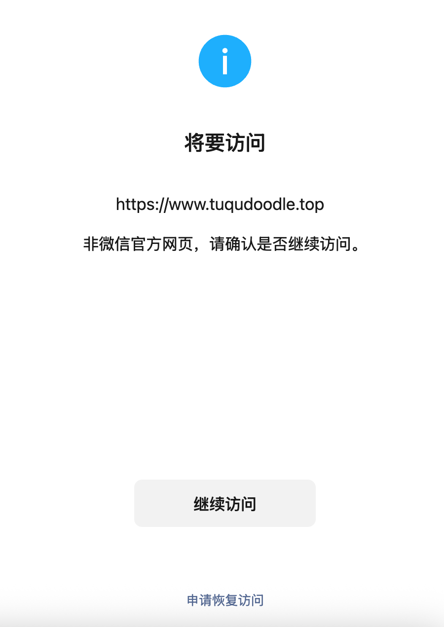 在微信app端访问域名www.tuqudoodle.top时,跳出提示“非微信官方网页”,此域名已经过备案,备案号 浙ICP备2025214130号-1,也已开启https防护,主要用途为:企业官网展示、H5 活动页面、客户业务后台、产品宣传页 等,无不良内容