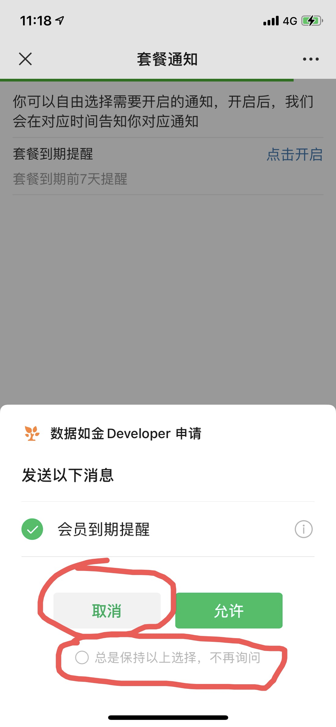 - 我知道勾选「总是保持以上选择,不再询问」并点击「允许」后,再次点「点击开启按钮」就会直接授权成功,但如果勾选「总是保持以上选择,不再询问」并点击「取消」按钮,订阅通知弹窗无法再被唤起这是预期内的结果吗?