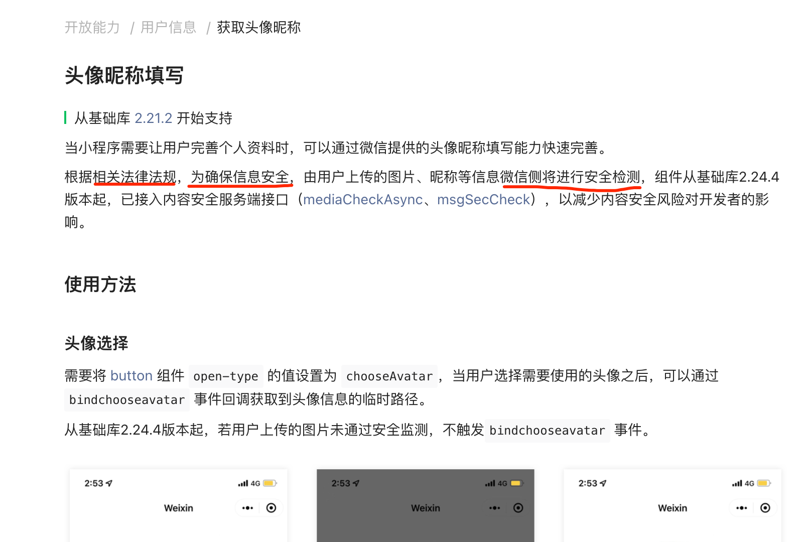 能力介绍:根据相关法律法规,为确保信息安全,由用户上传的图片、昵称等信息微信侧将进行安全检测