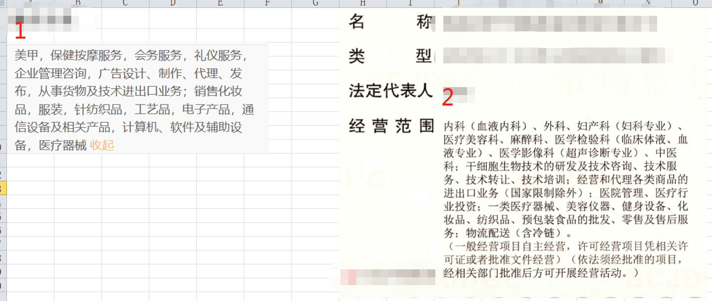 下图,左边“1”是我目标主体的营业范围,右边“2”是现有账号主体的营业范围