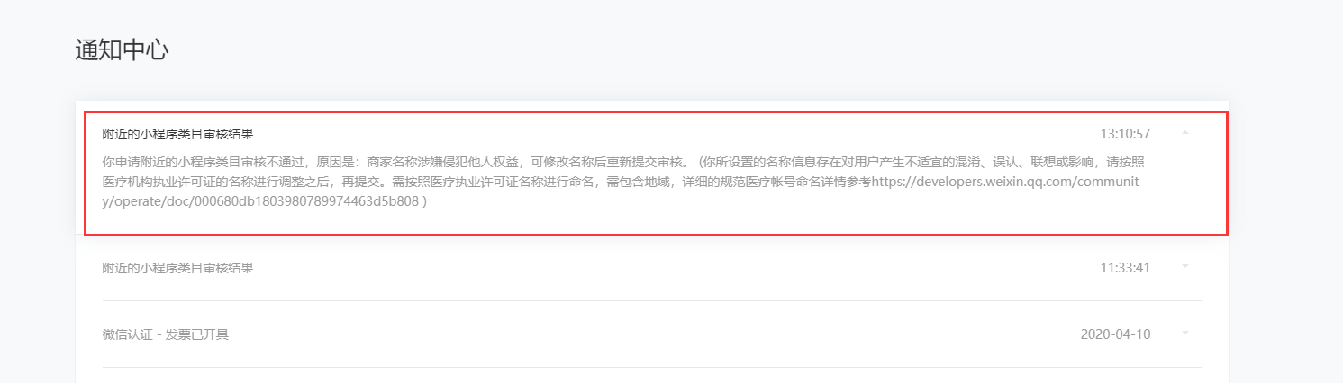 小程序开通附近功能,按照命名要求提交了相关医疗执业资格证书、商标证书、授权证书,怎么还是提示无法通过,哪里有出入吗?