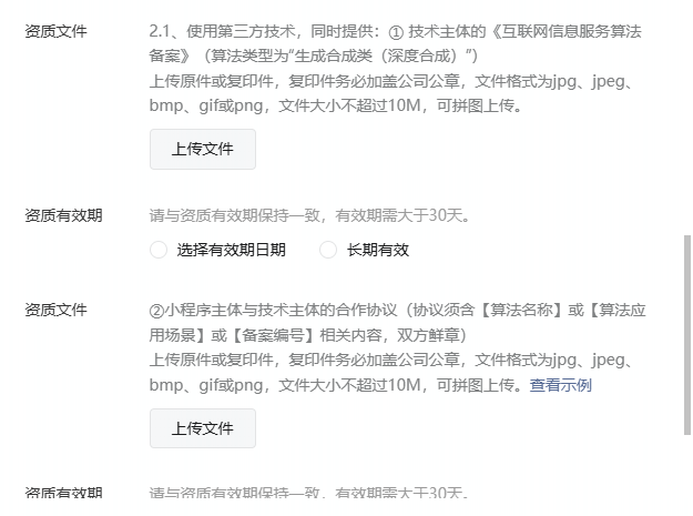 你好,经核实,用户申请【深度合成-AI问答】类目提供的协议缺少小程序主体鲜章,故审核暂不支持,若小程序主体无公章,建议可同时提供经营者的签名+手印+经营者手持身份证照的照片。
