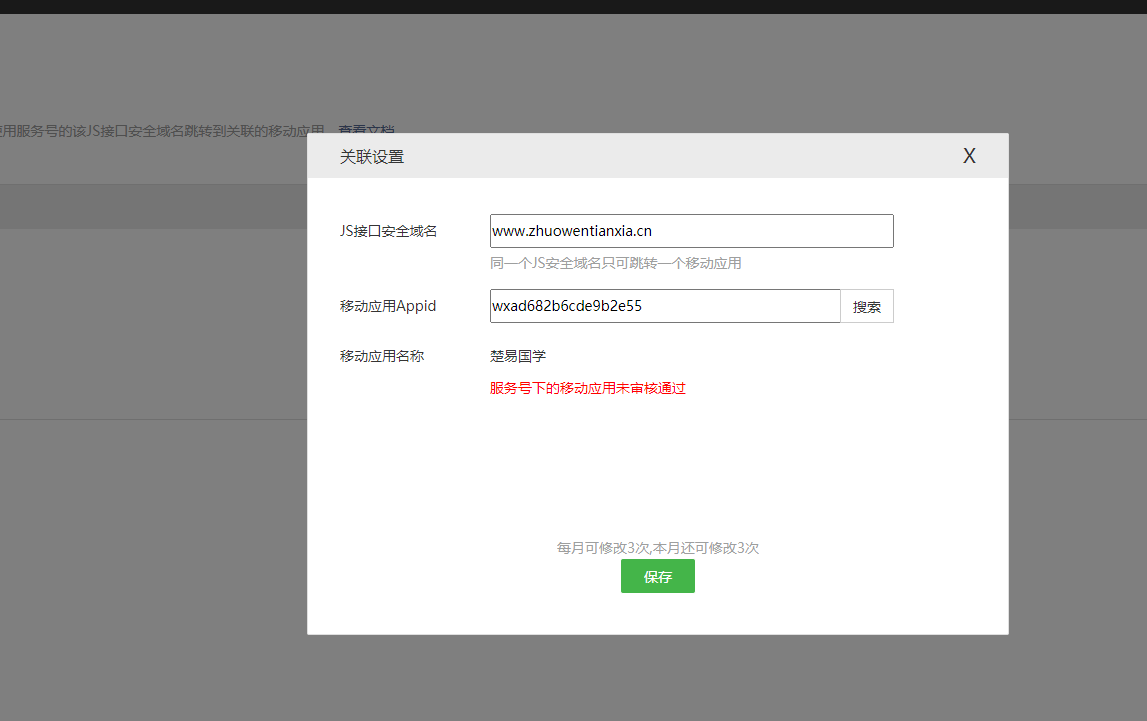 移动应用审核通过,服务号开放平台账号都已认证且同主体,域名是服务号里绑定的js安全域名且未绑定过其他应用