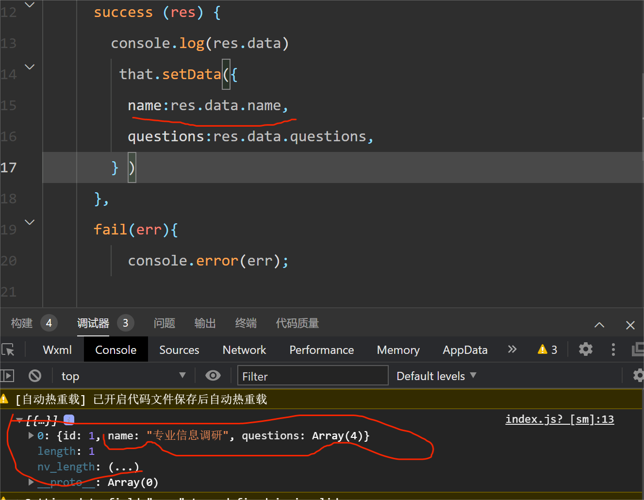 上图划红线的地方是我获取的值,但setdata一直获取的不是那部分的内容,所以模拟器也不显示,还一直提示: