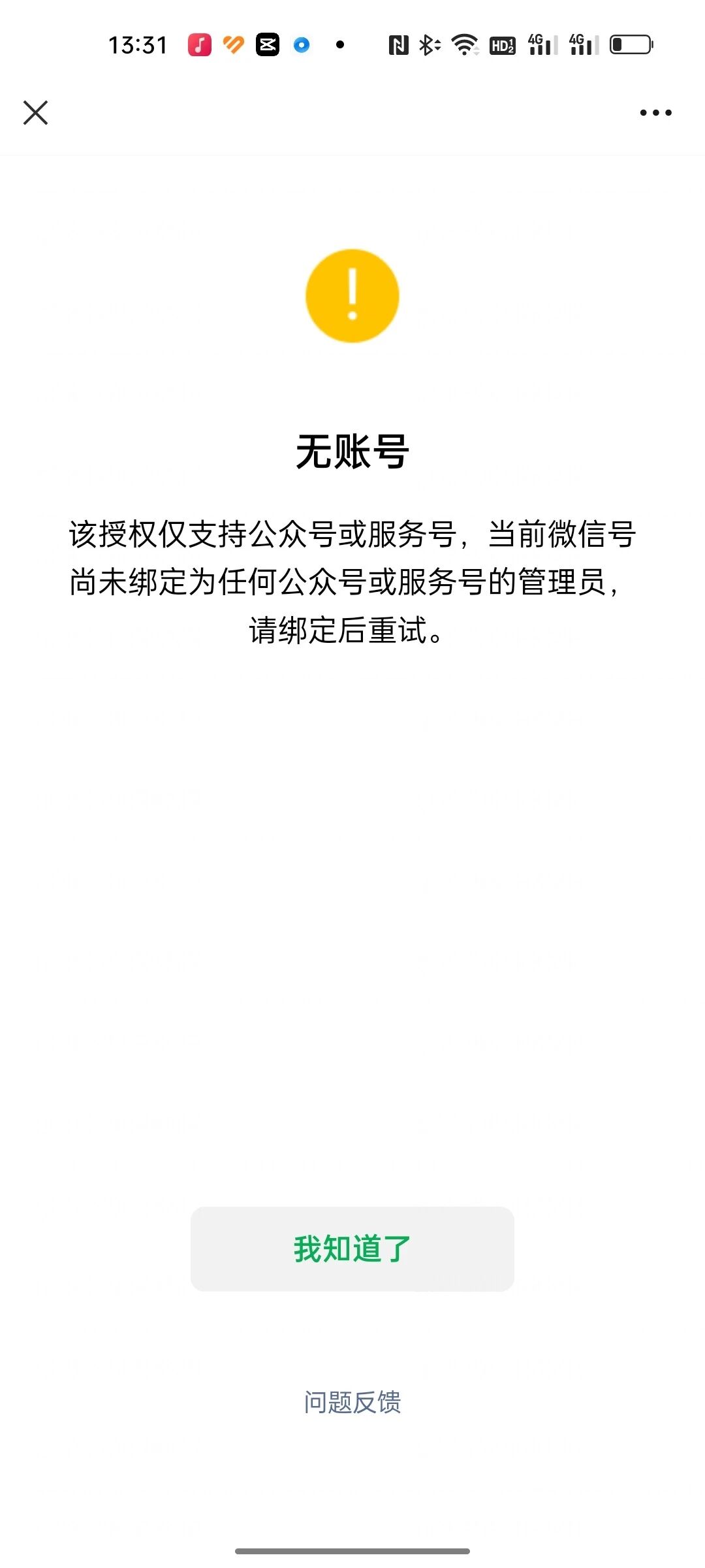 你好,请参考 https://developers.weixin.qq.com/doc/oplatform/Third-party_Platforms/2.0/troubleshooting/authorization_troubleshooting.html#%E4%BA%94%E3%80%81%E5%95%86%E5%AE%B6%E6%8E%88%E6%9D%83%E6%8F%90%E7%A4%BA%E6%97%A0%E6%B3%95%E6%8E%88%E6%9D%83%E3%80%81%E6%97%A0%E8%B4%A6%E5%8F%B7 自查。如确认当前扫码者是公众账号管理员身份,提供完整录屏资料(从显示微信号页面开始录制-->去公众号【公众平台安全助手】查看你名下作为管理员的账号-->再操作扫码授权)