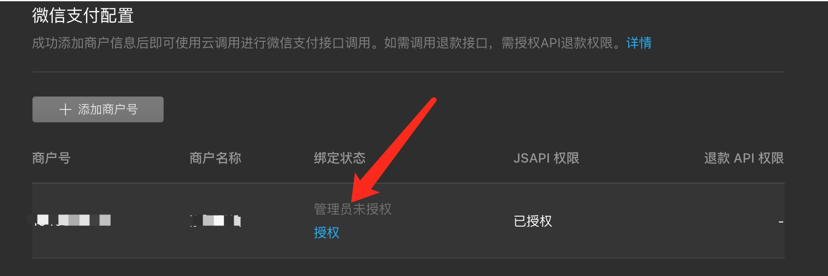 打开第二个小程序云开发控制台,显示绑定了商户号A上,但是“绑定状态”显示管理员未授权