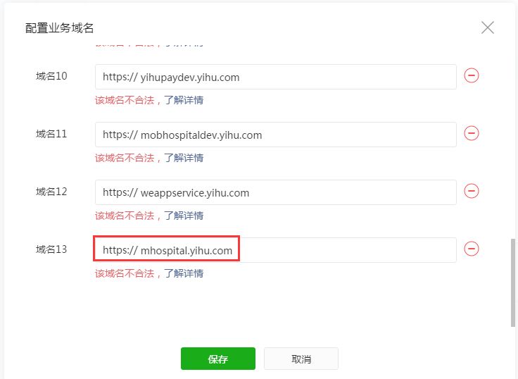 另外,之前已经成功添加的业务域名,也全部提示‘该域名不合法’