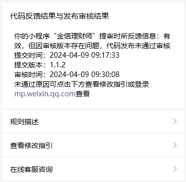 你好,经核实,你的小程序流程涉及账号登录或有测试环境配置要求,暂无法完整体验功能,请在提审页面填写有效账号及密码或上传小程序截图、录屏运行协助完成。请整改再重新提交代码审核,后续审核将以实际提交的小程序服务内容为准。