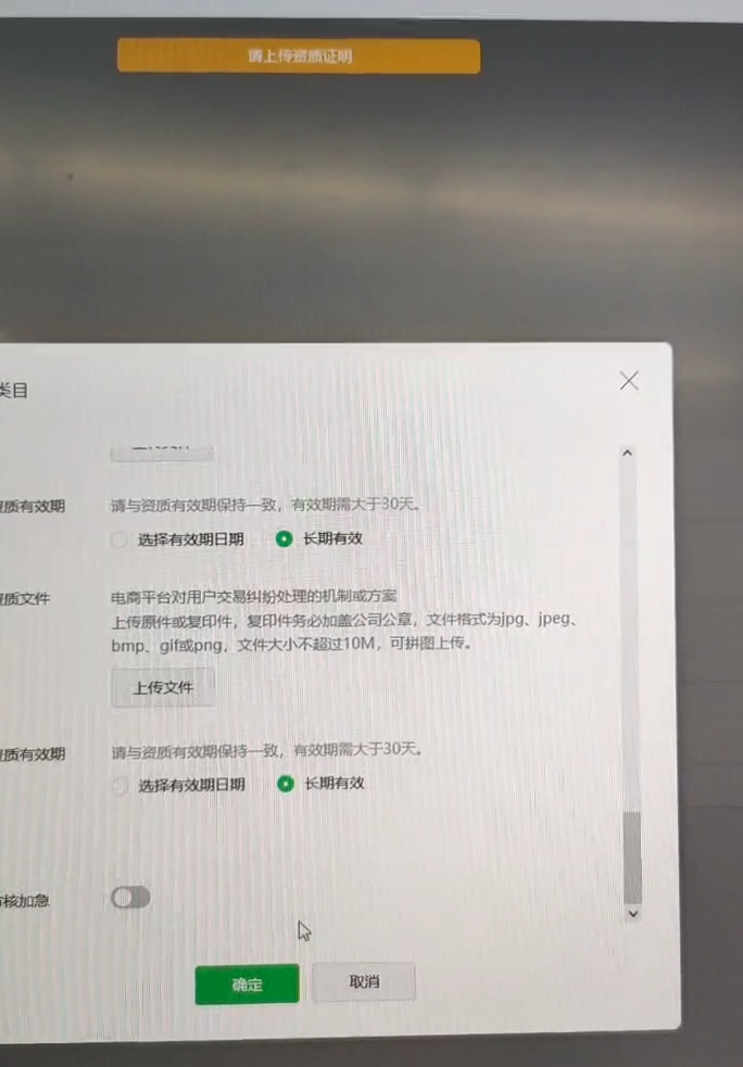 3、上传《增值电信业务经营许可证》图片、交易规则图片、入驻经营者的审核要求或规范协议图片、交易纠纷处理协议图片,点击下方“确认”按钮,弹出报错信息:请上传资质证明