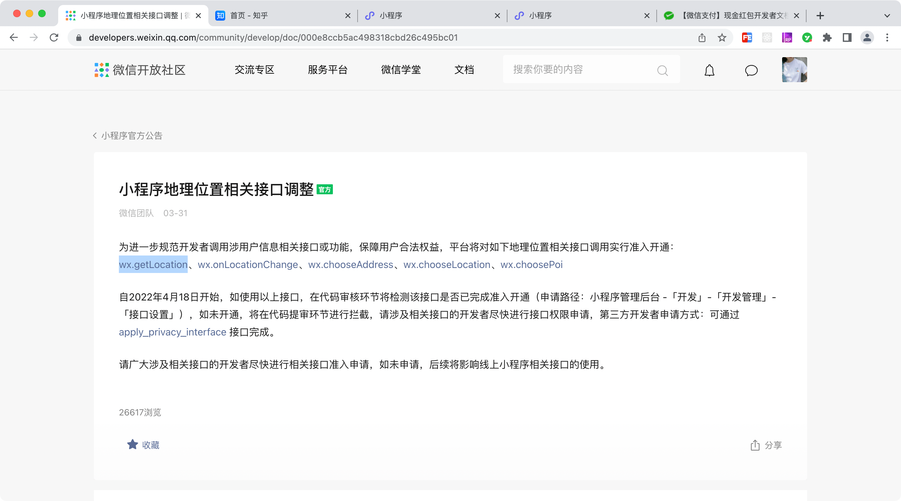 小程序地理位置相关接口调整? - 微信开放社区 https://developers.weixin.qq.com/community/develop/doc/000e8ccb5ac498318cbd26c495bc01