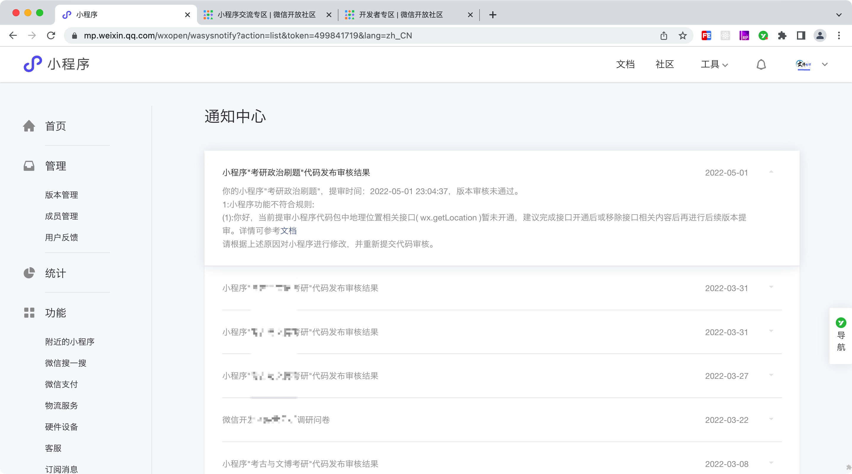 你的小程序"考研政治刷题",提审时间:2022-05-01 23:04:37,版本审核未通过。