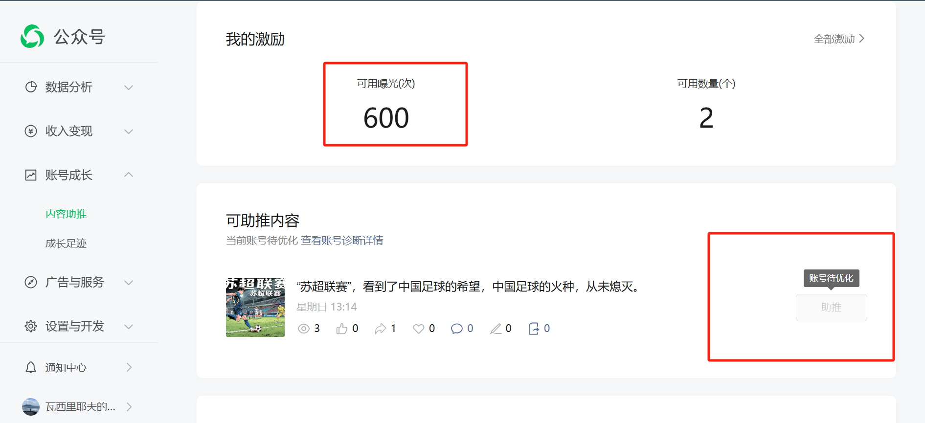 我有助推激励,但是因为显示账号待优化故一直不能助推