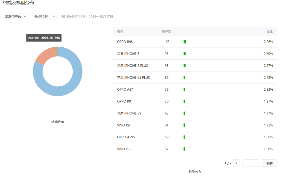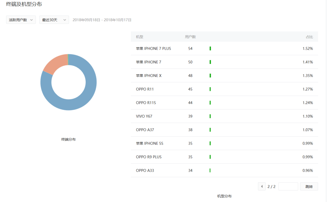 经核实因为当前访问小程序的机型太多,所以我们只展示了top20的机型。故右侧占比加起来不等于100%,后续我们会进行优化。