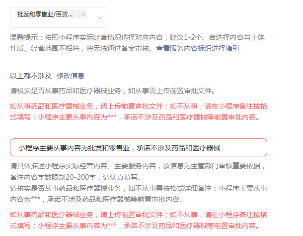 你好,请直接按备注格式进行填写,请复制粘贴以下:【小程序主要从事内容为***,承诺不涉及药品和医疗器械等前置审批内容。】并自行补充带星号内容。