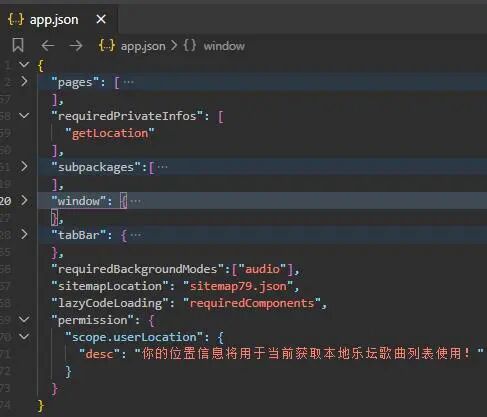 想向大家请教一下,按微信官方文档(具体可看这里:https://developers.weixin.qq.com/community/develop/doc/000a02f2c5026891650e7f40351c01)要求,需要在小程序后台开发设置的接口设置申请getLocation权限(这里已申请了,如下截图),并须要在app.json里按文档要求配置定位信息与引用(这里也设置了,如下截图),但不明白,最终微信开发者工具Stable 1.06.2206090在加载配置文件后,显示所配置的内容无效,这是为什么?(如下截图)