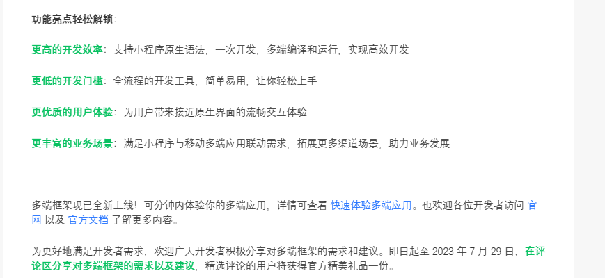 为更好地满足开发者需求,欢迎广大开发者积极分享对多端框架的需求和建议。即日起至 2023 年 7 月 29 日,在评论区分享对多端框架的需求以及建议,精选评论的用户将获得官方精美礼品一份。