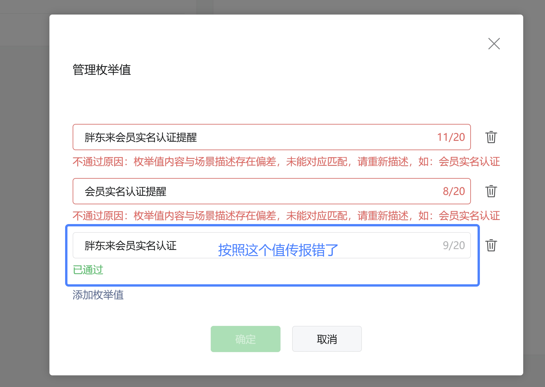 我们根据接口文档说明,猜测失败原因是枚举未携带关键词,按照接口要求重新提交了一个携带关键词“提醒”的枚举值申请,但审核未通过
