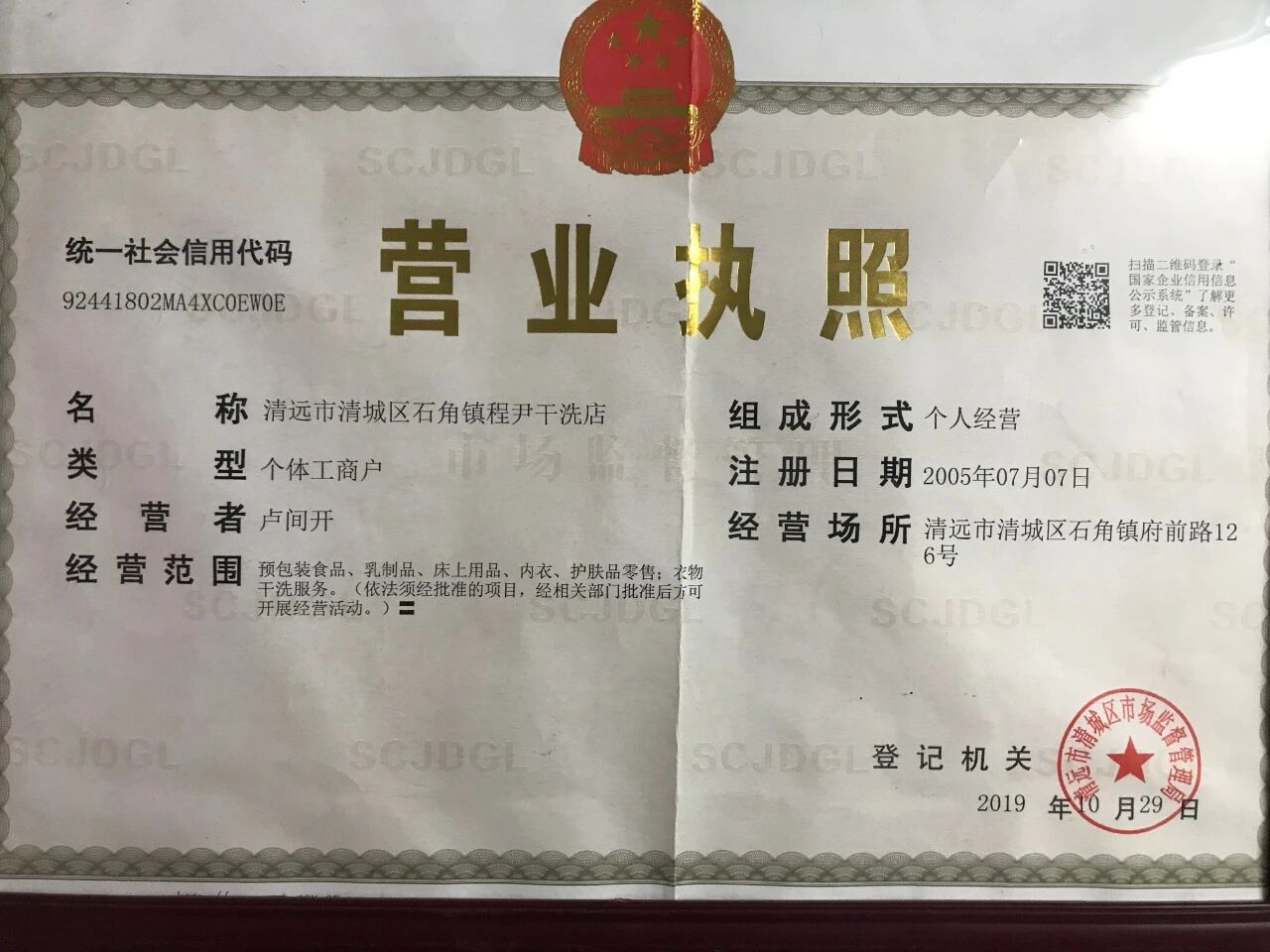 统一社会信用代码:92441802MA4XC0EW0E 法人:卢间开 名称:清远市清城区石角镇程尹干洗店