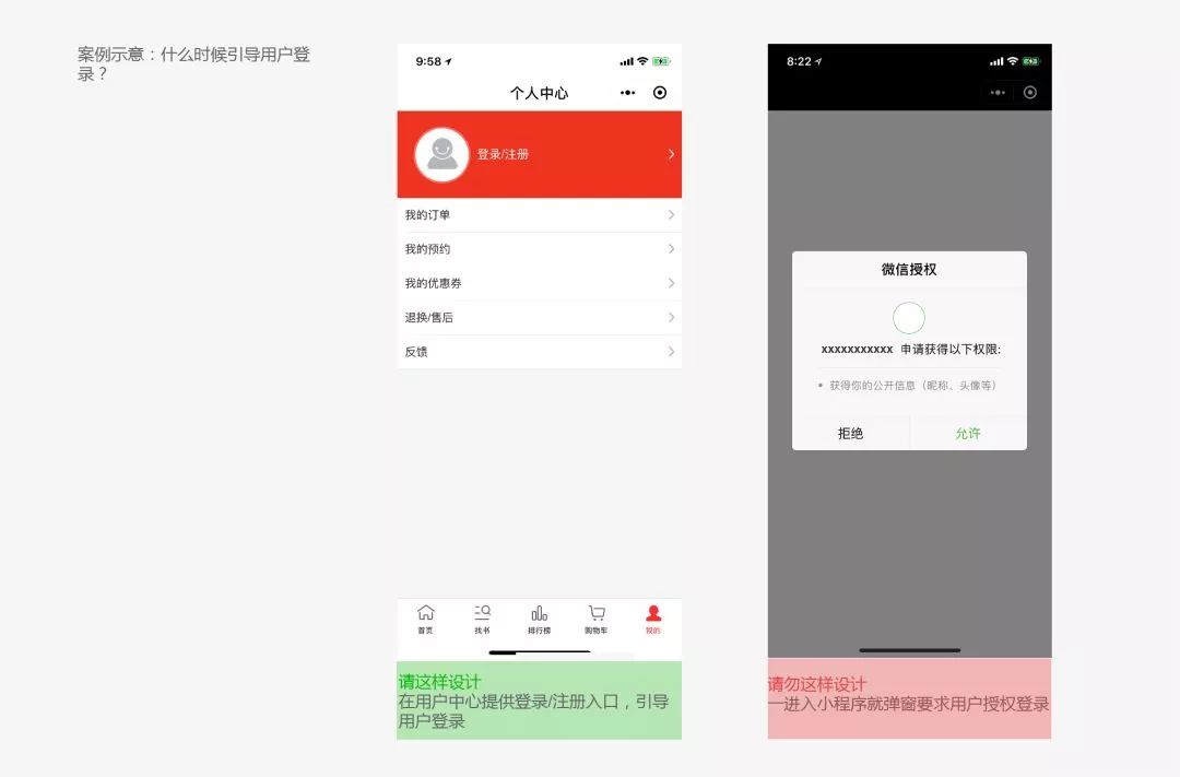 在用户必须登录时才引导用户登录(如:购买前需要获取会员信息,用于同步积分数据),而不是用户一进入小程序就弹窗要求用户授权。如只需要在前端展示用户头像、昵称,无需要求用户授权,可直接展示。