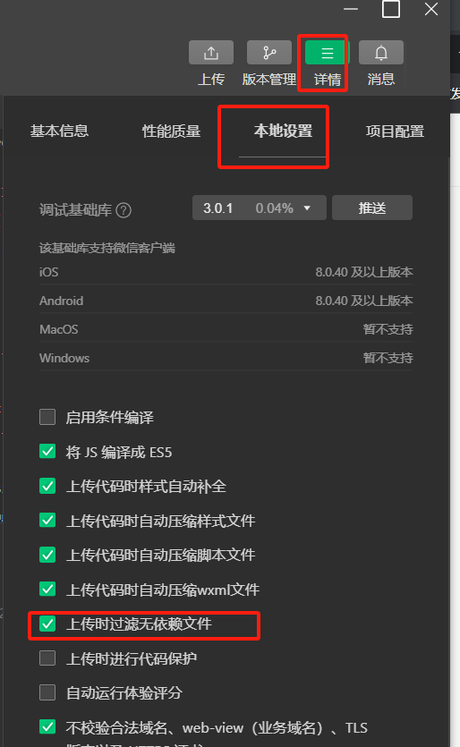 然后上传的时候会有提示 是否过滤了无依赖文件