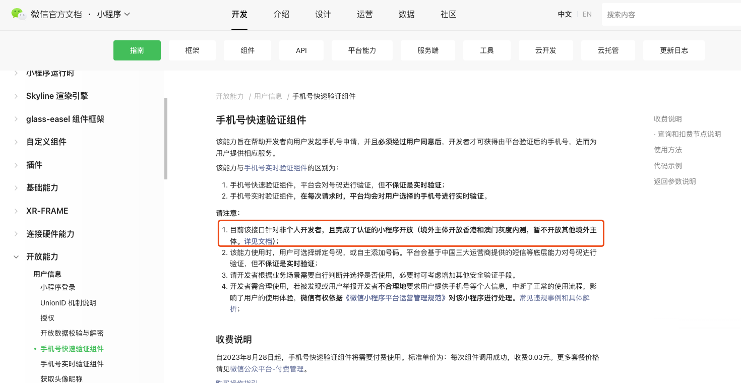 目前该接口针对非个人开发者,且完成了认证的小程序开放(境外主体开放香港和澳门灰度内测,暂不开放其他境外主体。详见文档);