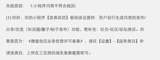 况且,打回的信息说,因为我们有个【发表说说】板块,要增加「社交」的类目,要准备的资质是「增值电信业务经营许可」。