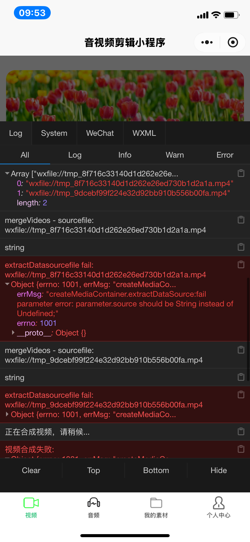 extractDatasourcefile fail: wxfile://tmp_8f716c33140d1d262e26ed730b1d2a1a.mp4 {"errno": 1001, "errMsg": "createMediaContainer.extractDataSource:fail parameter error: parameter.source should be String instead of Undefined;"}