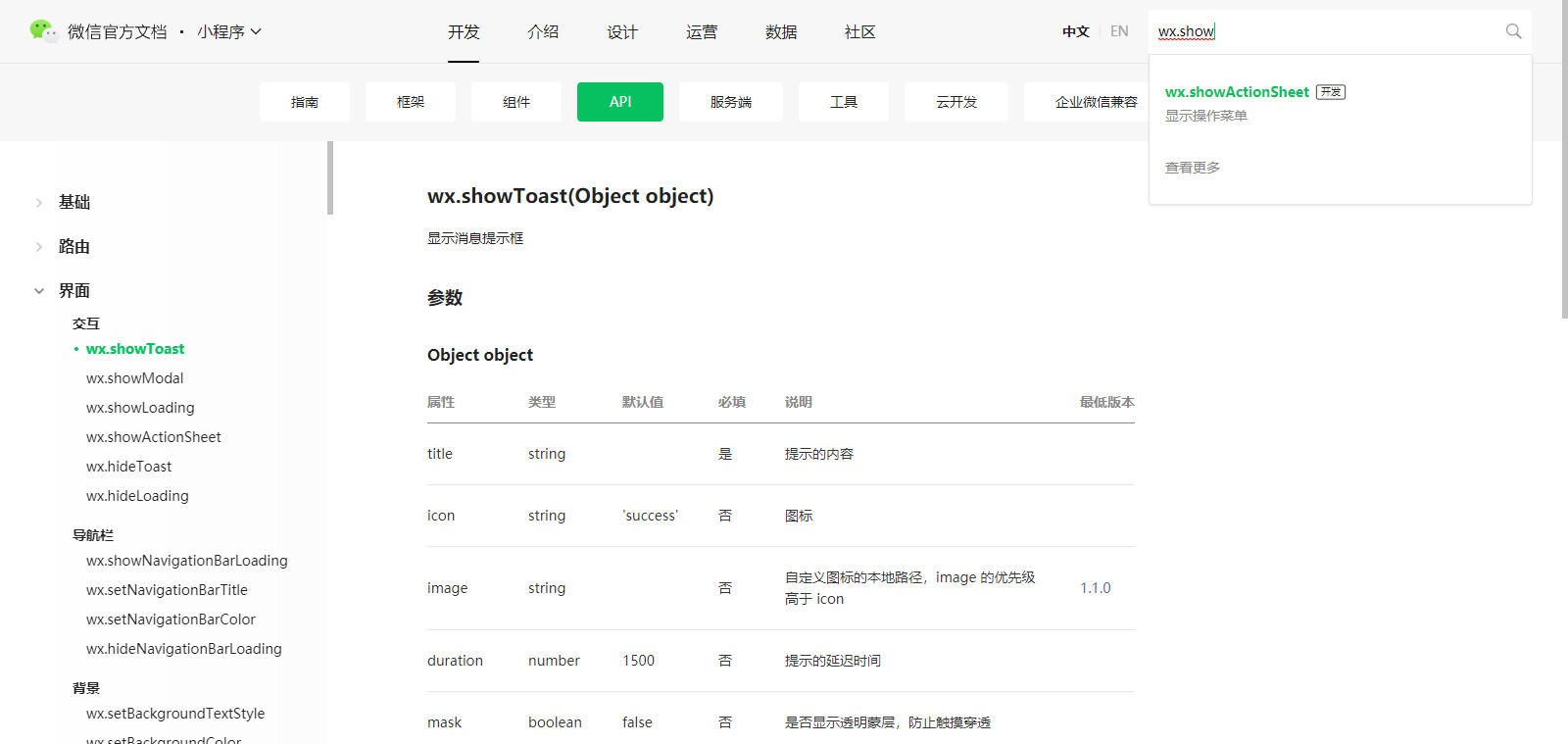 如图所示,我搜索 wx.show 相关的 api 只出来一个最不想要的。