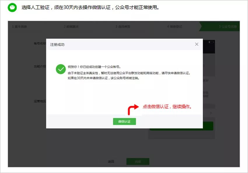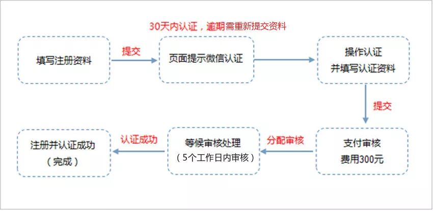 注:记得要在30天内(自然日)去操作微信认证,认证通过,才算注册并认证成功,帐号才能正常使用。