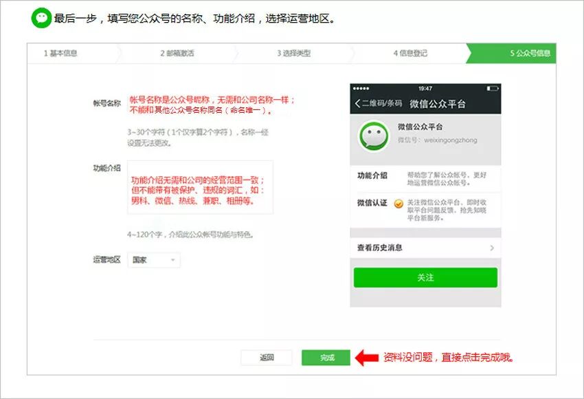最后一步:填写公众号名称、功能介绍、选择运营地区就可以了。