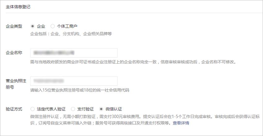 注:微信认证注册方式是人工审核,需要服务审核费用300元。