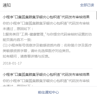 我们不明白,我们申请小程序名字,有的名字需要提供医疗相关的证件,有的不需要。请问:我们小程序名字腾讯已经通过。审核代码人员是审核代码的,还是审核小程序名字啊?每次提交以我们无法理解的理由,驳回我们提交的代码,请麻烦工作人员,能够给予解决代码审核的问题,多谢!