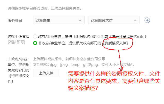 我们小程序开发完成需要提交审核,小程序名称提示需要资质证明,服务类目需要提供资质授权文件,授权文件到底需要盖哪个部门的章?对授权文件的内容要求能否进一步说明?