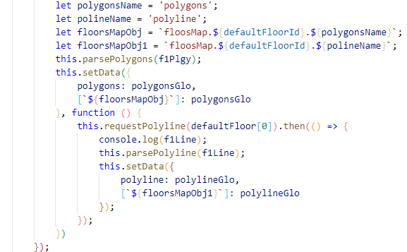 this.requestPolygons(defaultFloor[0]).then(() => {console.log(f1Plgy);let polygonsName = 'polygons';let polineName = 'polyline';let floorsMapObj = `floosMap.${defaultFloorId}.${polygonsName}`;let floorsMapObj1 = `floosMap.${defaultFloorId}.${polineName}`;this.parsePolygons(f1Plgy);this.setData({polygons: polygonsGlo,[`${floorsMapObj}`]: polygonsGlo}, function () {this.requestPolyline(defaultFloor[0]).then(() => {console.log(f1Line);this.parsePolyline(f1Line);this.setData({polyline: polylineGlo,[`${floorsMapObj1}`]: polylineGlo});});})});},可以看一下es6的Computed property names。