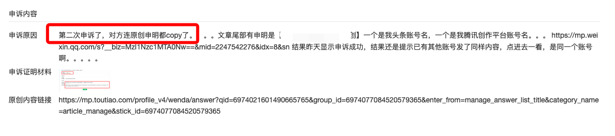 更重要的是,发现被抄袭时,是在我需要发布文章的时候,当时有两个链接入口:一个是抄袭者的文章链接,一个是申诉链接,在这个流程里,谁会去点击抄袭者链接?